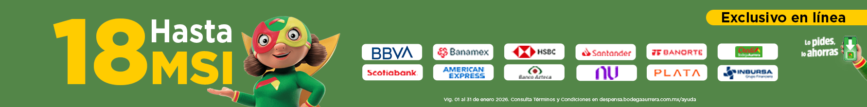 ¡Tu despensa siempre gana con el poder de ahorrar mucho más en Bodega Aurrera en Línea! Aprovecha tu Morralla y compra tu canasta básica con los precios más bajos. Encuentra todo para tu hogar y los abarrotes, frutas y verduras favoritos de tu familia. Pide en Bodega Aurrera en Línea o desde su App los productos de farmacia y electrodomésticos, pantallas y videojuegos que te hacen la vida más fácil y divertida. Paga con vales de despensa, tarjeta de crédito, débito o en efectivo y recibe todo sin salir de casa con Envíos express, Envíos a domicilio o Recoger en tienda, ¡tú eliges!